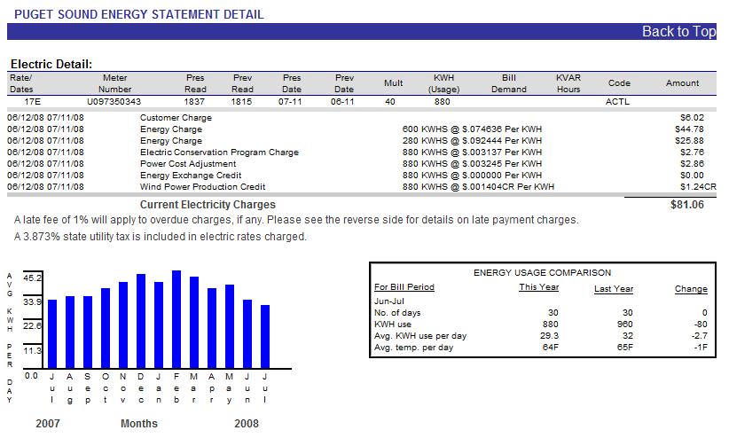 Now I have some basic knowledge. In June, we used 880 KWH. This was down from 960 KWH the previous June. We made two changes to how we use electricity in the last year: 1. We changed all our bulbs to compact fluorescent bulbs, and 2. We replaced our water heater, which was previously gas. Logically, you think we would be using more electricity. Could the compact fluorescent bulbs have that much impact? I have no idea. Is 880 KWH good or bad? Again, no idea. So this is my next step, to really understand our typical energy usage and how it is being used.