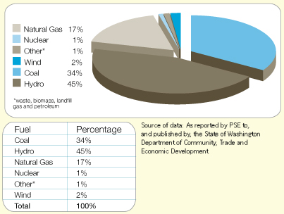 After discovering that we used 880 KWHs in June, I decided to learn more about how these 880 KWHs of electricty were created. I went to my friendly local utility Web site, Puget Sound Energy, and found quite a bit of useful information in the Energy and Environment section. Now I realize that a utility company isn’t exactly the most unbiased source for information about the environmental impact of energy generation, but the site did contain some very interesting, and hopefully credible, information. First of all, the site publishes a graph of the energy sources used to generate the electricity it distributes. Here’s the graph: