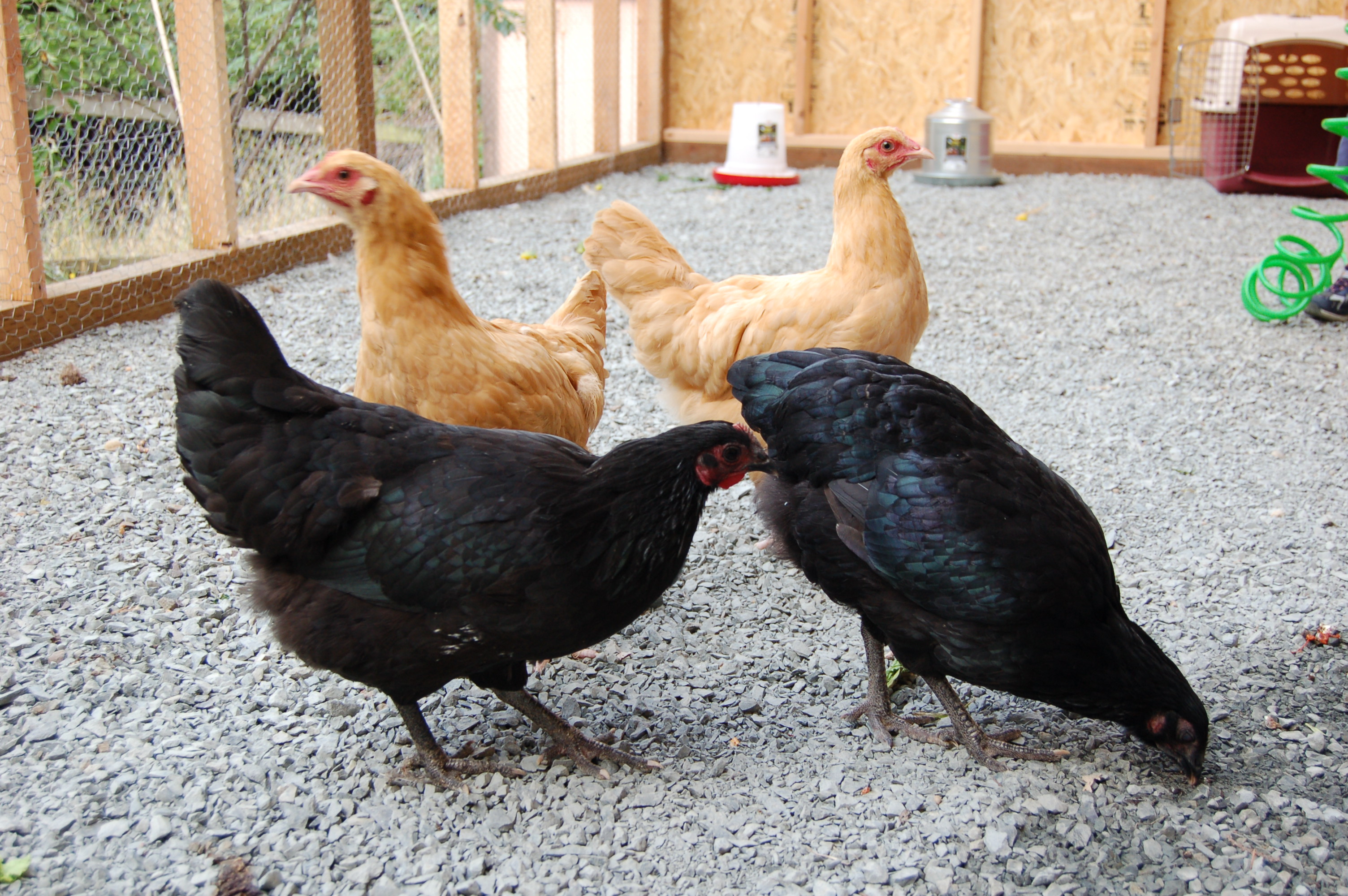 In other news, I am sad to report that we’ve lost a chicken. A few mornings ago I realized that there were only five chickens in the coop/run. I looked all around but didn’t see the sixth chicken. We’ve been letting them free range a bit during the day and I think the chicken jumped over the fence and couldn’t get back in. When I closed them into their coop that night, I think I closed one chicken out of the coop. We found a pile of feathers in our yard, so we know for sure it is gone. The lost chicken was one of our Buff Orpingtons, the one we named Blondie. So RIP Blondie. I hope you went quickly.