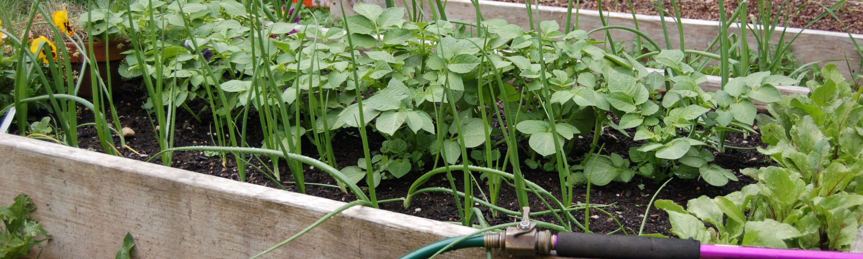 In this photo, you can see how happy the plants are in the outdoor raised beds. This bed has a combination of onions, potatoes, and beets. I hadn’t originally planned to put potatoes in this bed, but I had a few extra La Ratte potatoes and decided to plant them down the center of the bed.