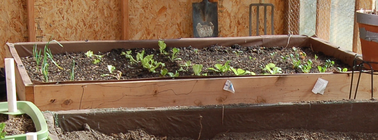 Speaking of the greenhouse, the first bed that we mole-proofed is now filled with my first batch of seedlings. This bed has lettuce, kale, bok choi, and Chinese cabbage. I also threw in a few garlic bulbs I found leftover in an outdoor bed. On cool nights, I’ve been covering everything with a grow cloth, but generally everything is doing really well and showing good growth.