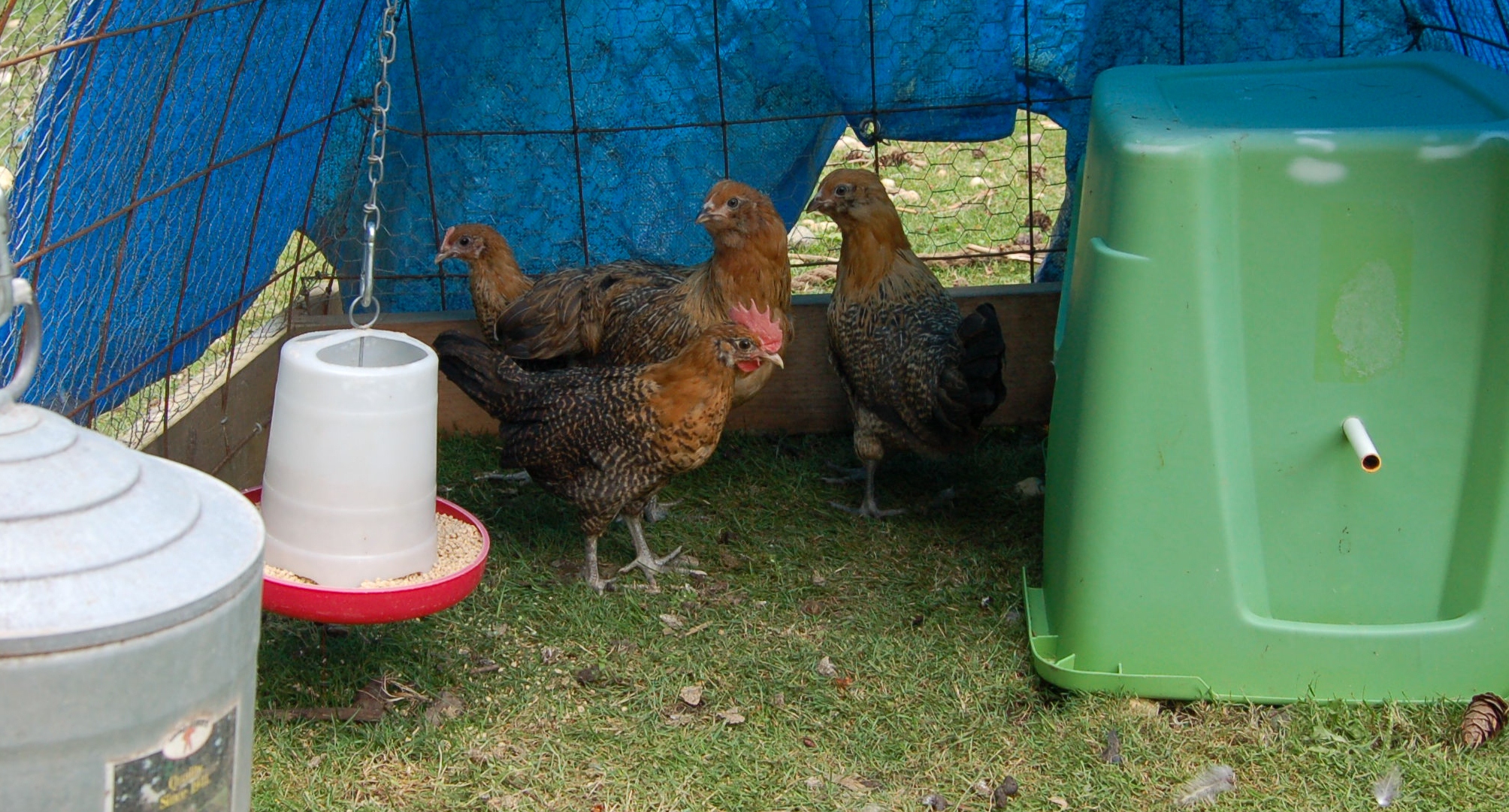 Finally, I’ll leave you with a picture of our newest chickens. As you can see, one of these chickens is not like the other. Yes, we have a rooster in this batch. We haven’t determined his fate yet. We moved the new chickens out of the garage yesterday into the chicken tractor in the pasture. They’ll live in the tractor until they are large enough to join the rest of the flock.