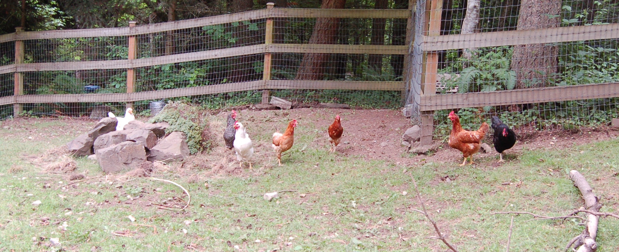 Out in the pasture, the chickens scratched away at a pile of weeds I threw to them. This is the north side of the pasture under several large evergreen trees, so there isn’t a whole lot of grass in this area. The exposed dirt does give them good places to take dirt baths, which they seem to enjoy (as much as a chicken can enjoy).