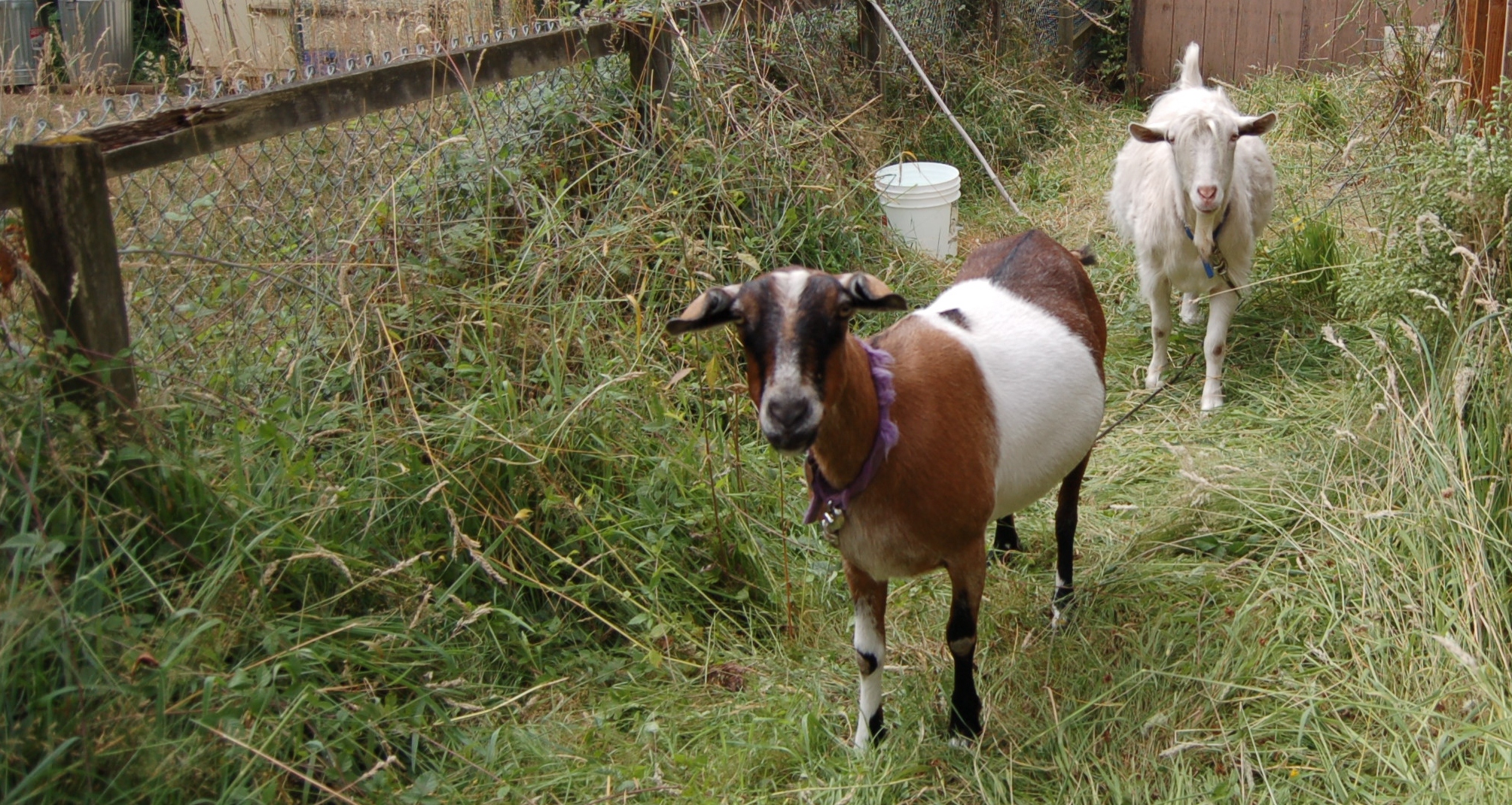 Outside the greenhouse today, we had the goats hard at work. Derek has set up a series of “hitching posts” to stake out the goats so they can graze and cut down grass and vegetation. This is a winning solution all around. The grass and vegetation get cut down, the goats get food, it’s quiet, and doesn’t involve heavy labor with a gas guzzling mower.