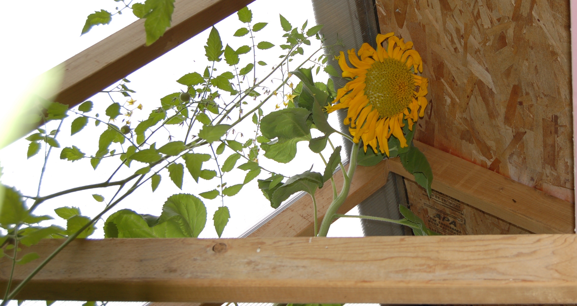 Inside the greenhouse, the sunflower plants have grown as tall as they possibly can. These “Humongous” sunflowers are living up to their name. The top of the greenhouse is about 12′ tall, so these plants have far exceeded the 5′ – 7′ size noted in the plant description.