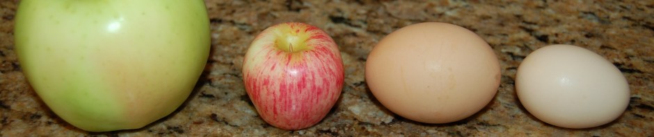 We’re starting to see some ripe apples from our various and sundry trees.  The larger apple is a Chehalis and the smaller apple is a windfall Honeycrisp that was blown down in last night’s rain.  I don’t know about you, but the smaller apple certainly looks riper and more appetizing.  The larger egg is from one of our established hens, while the smaller is the first egg from one of our new ladies – one of the three Barred Rock pullets we picked up after the mystery deaths of an Americana and Golden Campine pullet.