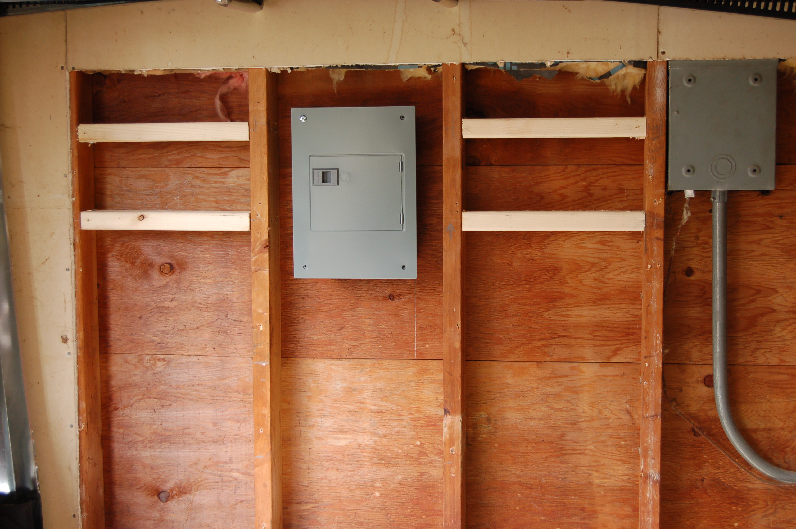On day two, the electricians came out and began the prep work to install the inverters and the high-voltage home runs from the inverters to the panels. Note the breaker box between the planned inverter location – this is one of three cutoffs (not including the off/on switch on the inverters themselves) that can be used to disconnect the solar panels from the incoming line voltage.
