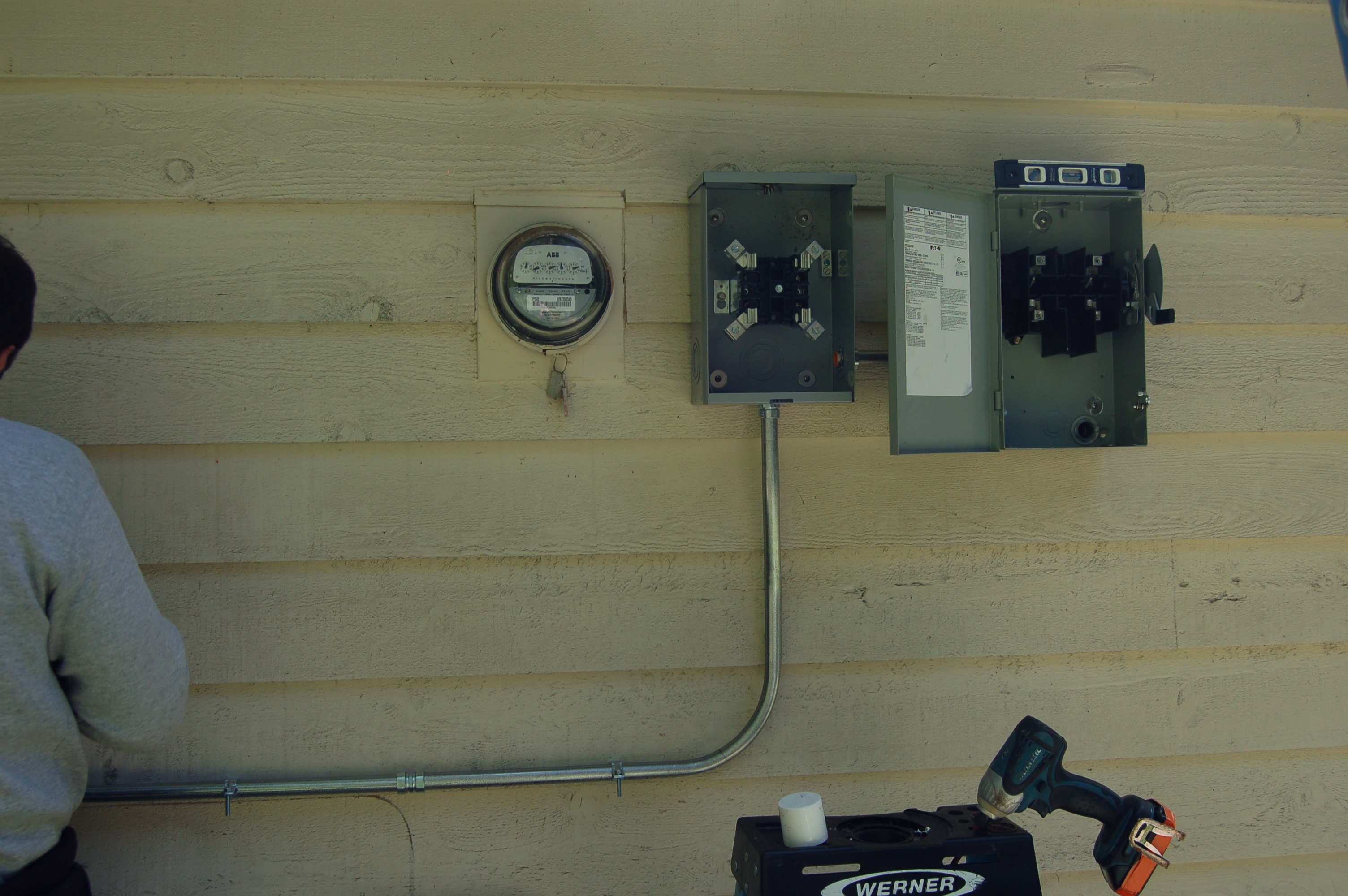These panels then run through a series of breakers (safety, safety) and a massive cutoff switch to a pair of meters – one that measures the total production in kWH (for the $0.54 incentive payment calculation) and one that measures net consumption (e.g. house consumption minus PV production).