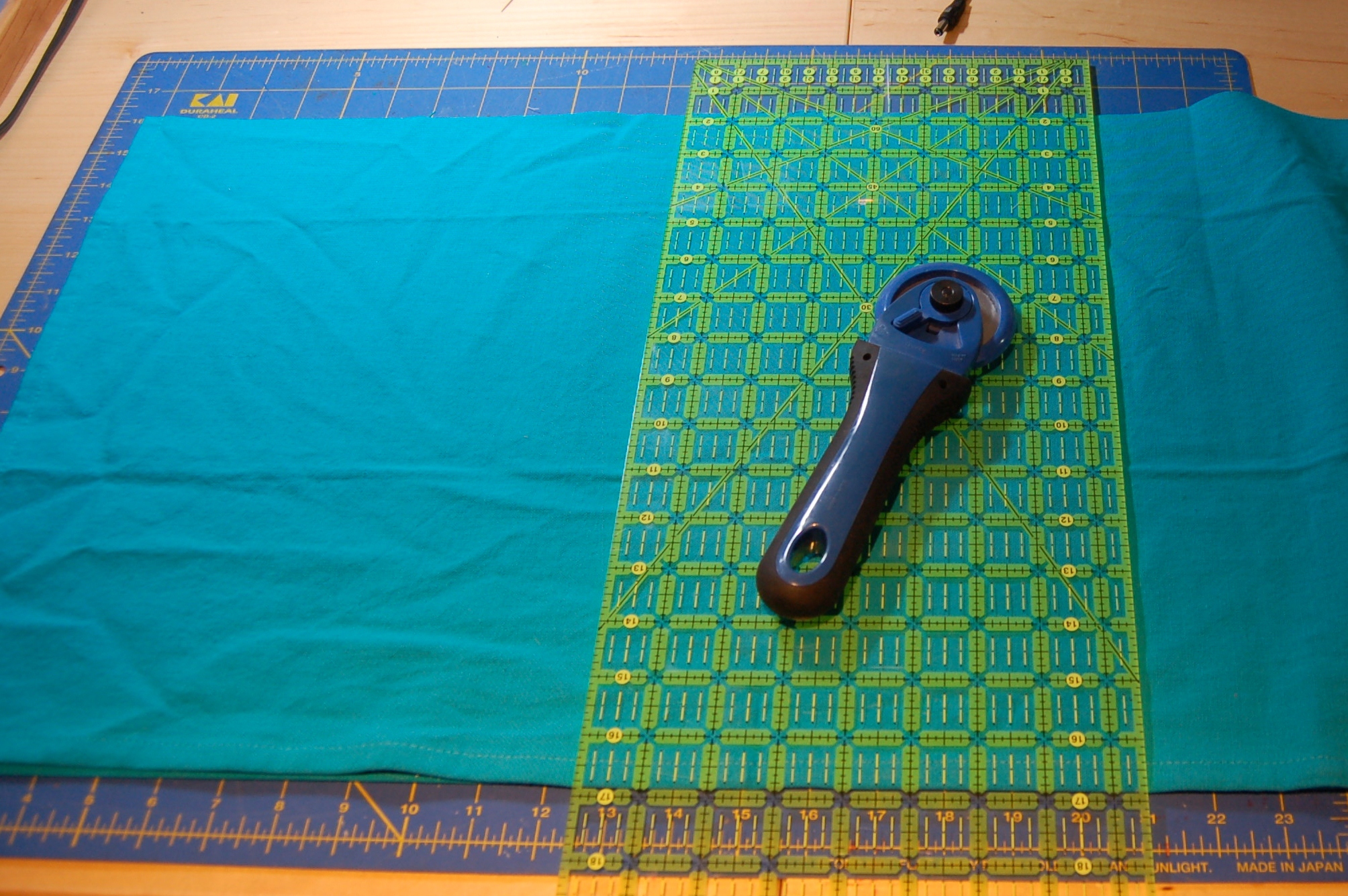 Cut the side and bottom pieces. For my bag, this meant two 6″ X 20″ pieces for the sides and one 6″ X 15″ for the bottom.