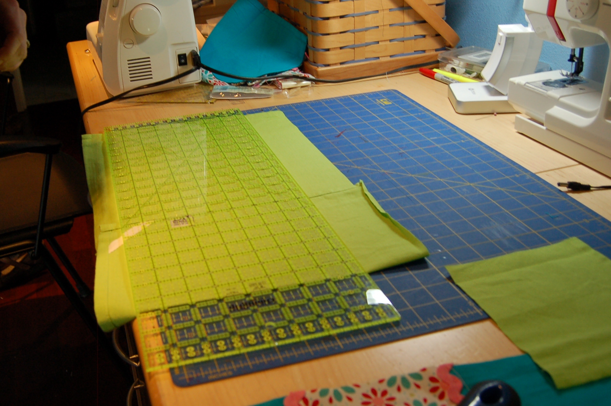 The first part is always the most fun – picking out fabrics! Instead of just making a plain bag, I decided to adorn the turquoise tea towel fabric with a flower-patterned stripe and some pink rick rack. To do this project, you’ll need two (or three tea towels) depending on the size you want, a fat quarter pattern for the stripe, rick rack, and bag strapping. I used my quilting supplies for easy measuring and cutting.