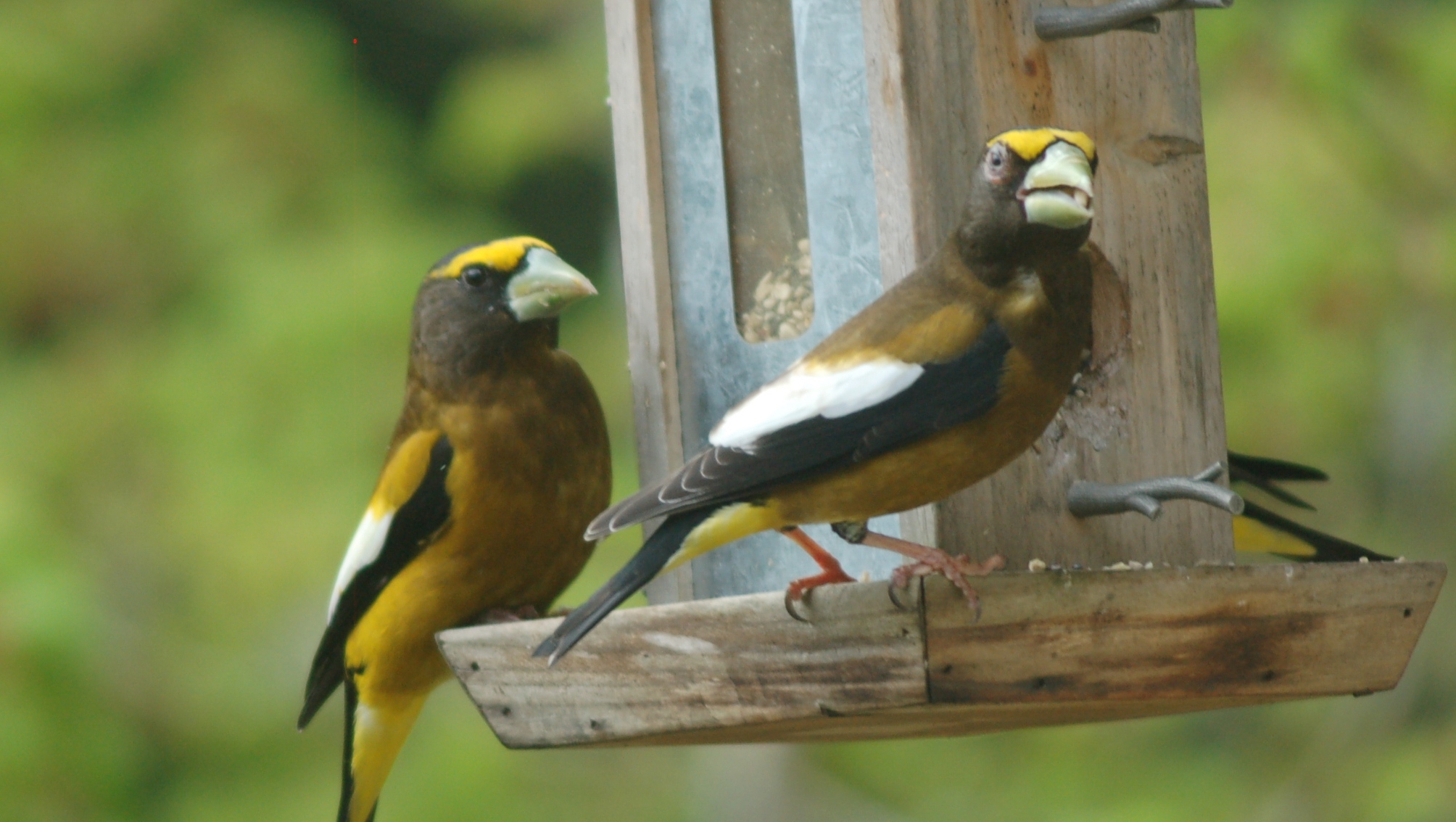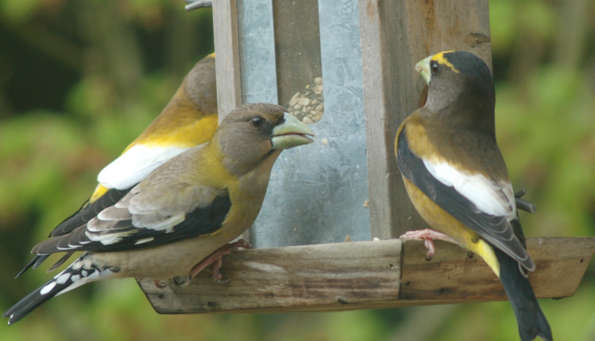 A flock of Evening Grossbeaks stopped by for a snack today and Derek took some shots. True to their reputation, the cleaned out our feeder. Pretty birds.