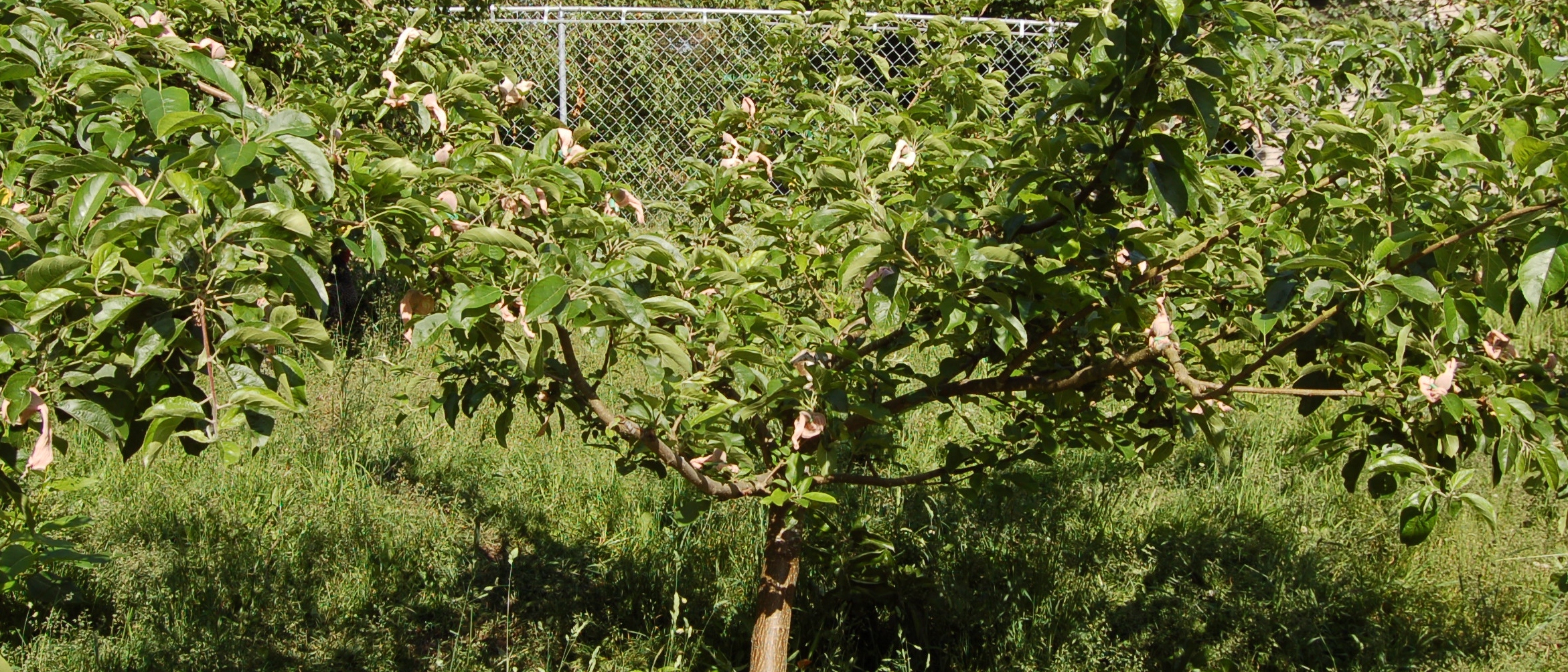 Here’s what a bagged apple looks like. A few tips here. I thin the apples at the same time I do the bagging. I’ll pick a few branches, thin them out, and then do all the bagging. If you notice in the picture above, I try to place the apple in the middle of the nylon sock, leaving extra nylon fabric near the stem and at the base of the apple. I do this because the apple will obviously grow a lot and you want to make sure the apple won’t outgrow the nylon near the stem, nor be too tight at the base.