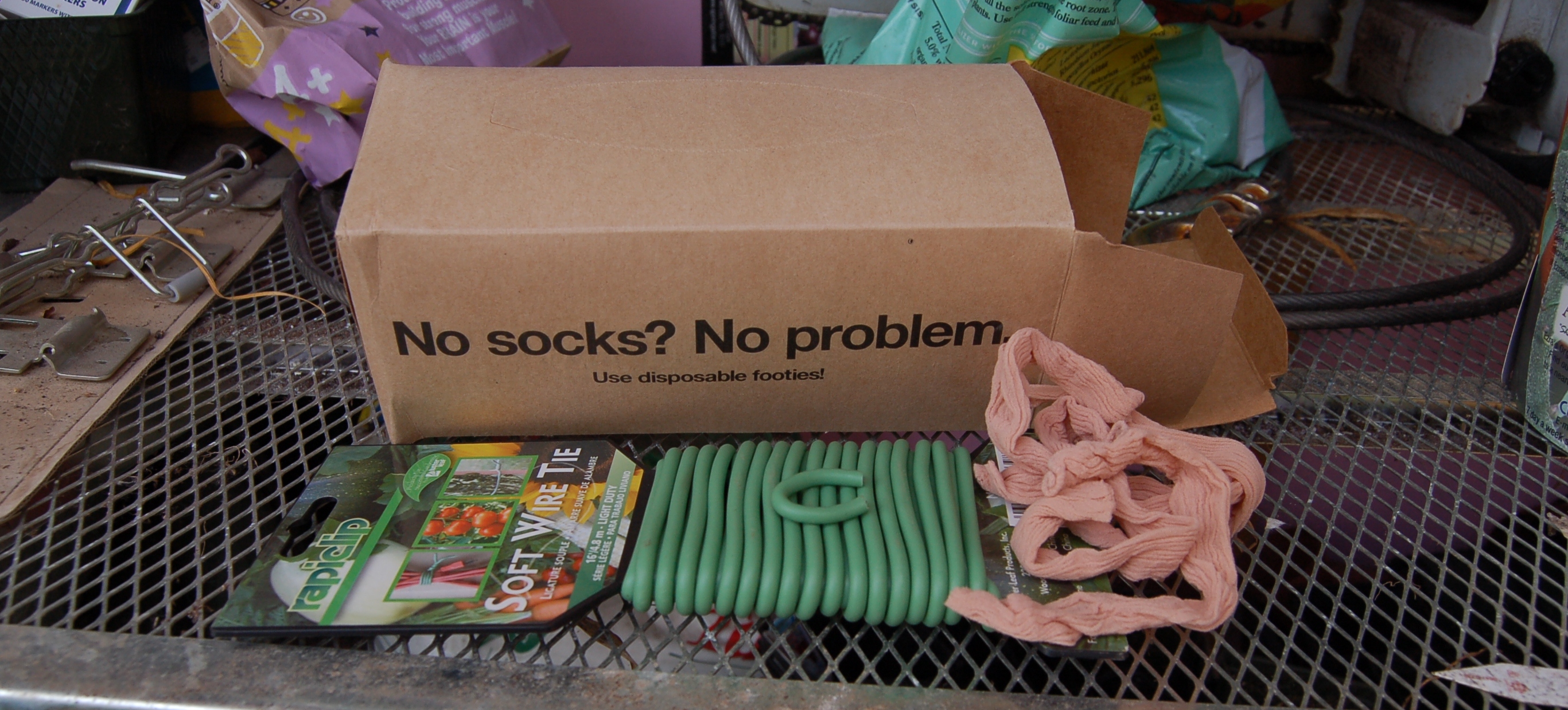 So, this year I am using soft wire ties instead of the rubber bands. I wrapped the wire tie around my index finger and snipped it with a pair of wire cutters. This ended up being the perfect size for the ties. I bought the nylon socks in bulk on eBay last year. They were really cheap this way.