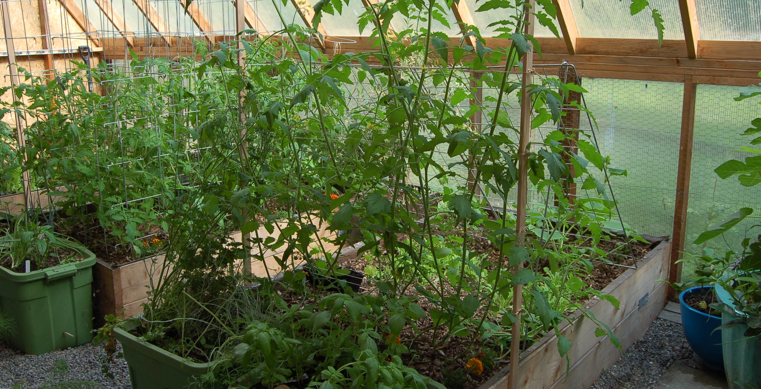 In spite of the wet, cool conditions outside, the tomatoes in the greenhouse are putting on signficant growth and are starting for form tomatoes. This year, we’re doing something new to trellis the Sungold tomatoes, which get huge in our greenhouse. Last year, the Sungolds easily reached over 10′ high (reaching as high as the giant sunflowers we grew in the greenhouse last year). What we did was attach wood posts to the outside of the raised beds, securing them to the rafters in the greenhouse. I’m using twine to support the tomatoes as they grow up.