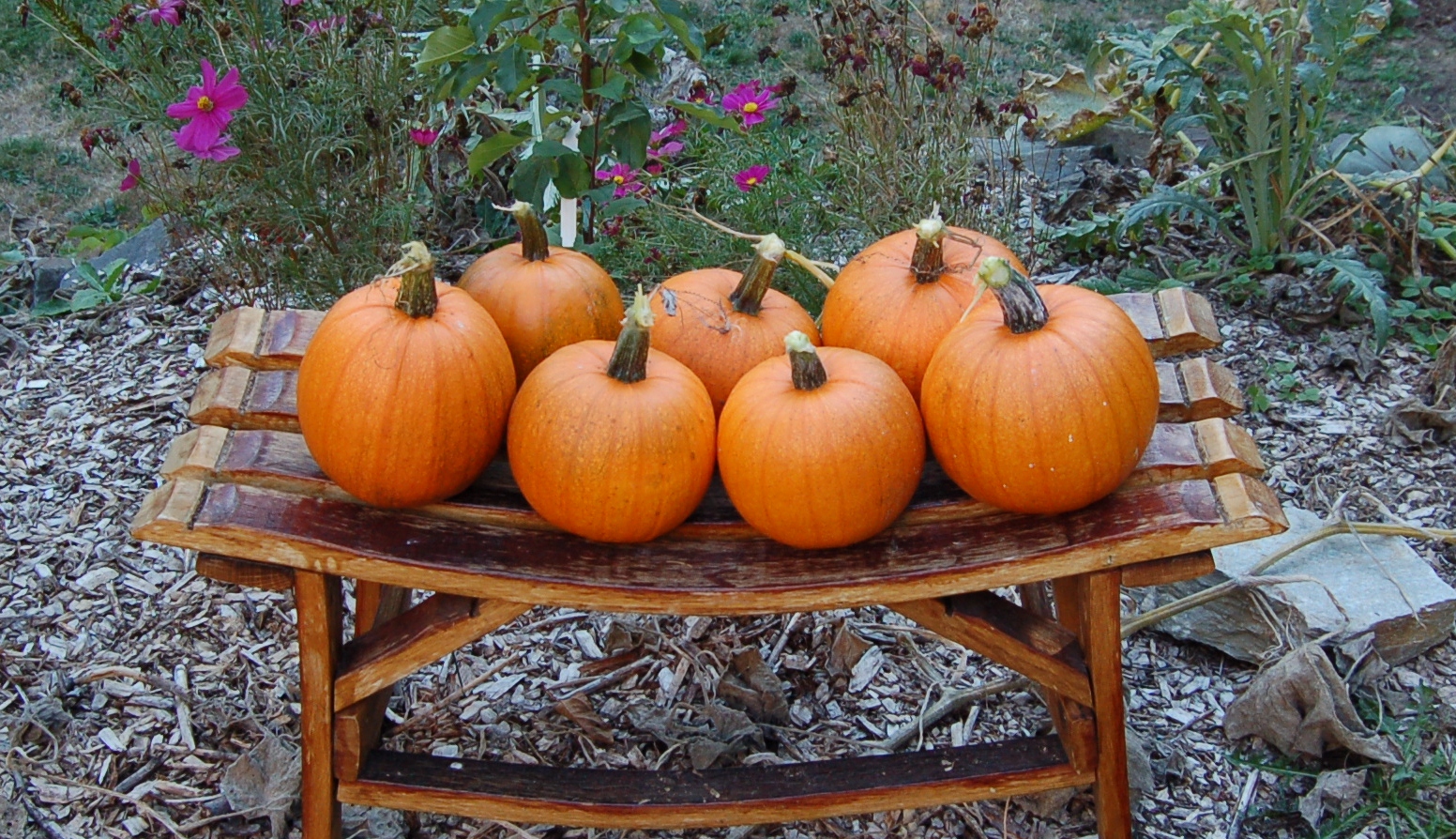 No idea on what variety of pear that is – but it is a beauty! The pumpkins are just charming looking sitting on that curved seat bench. Looks like something from a garden calendar photo shoot.